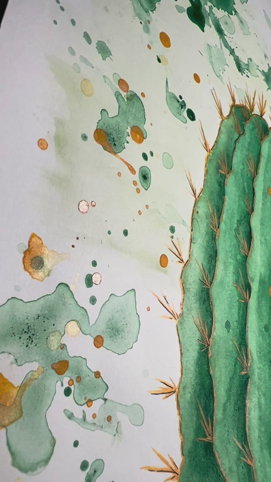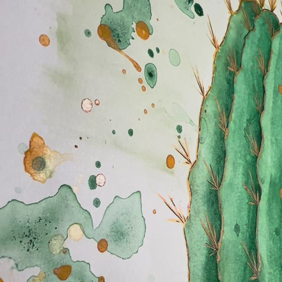 This original watercolor cactus artwork blends soft gradients of green with expressive splashes and warm golden details. The contrast between fluid movement and sharp lines symbolizes strength, resilience, and growth through unpredictability.