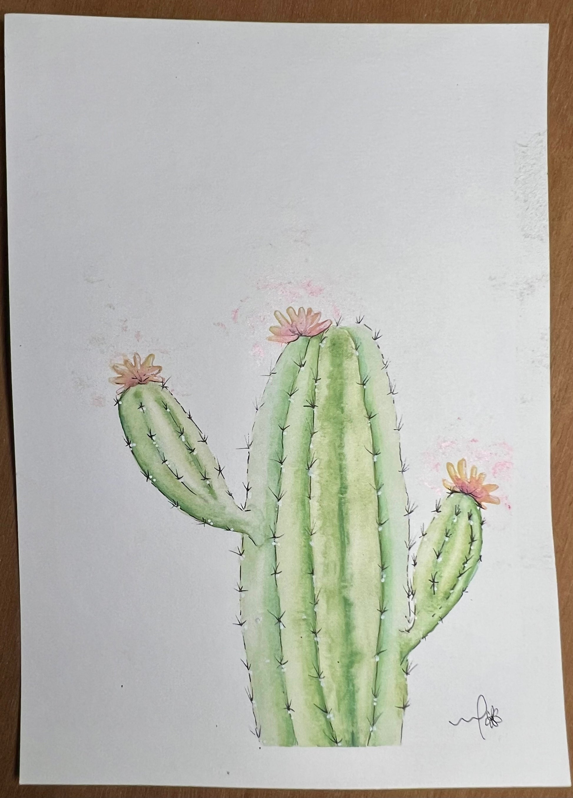 Cette dĂ©licate illustration de cactus fleuri est rĂ©alisĂ©e Ă lâaquarelle, dans des tons de vert doux et de rose poudrĂ©. Les fleurs symbolisent la rĂ©silience, la douceur et la beautĂ© qui peut Ă©merger mĂȘme dans les environnements les plus arides.