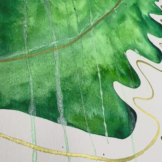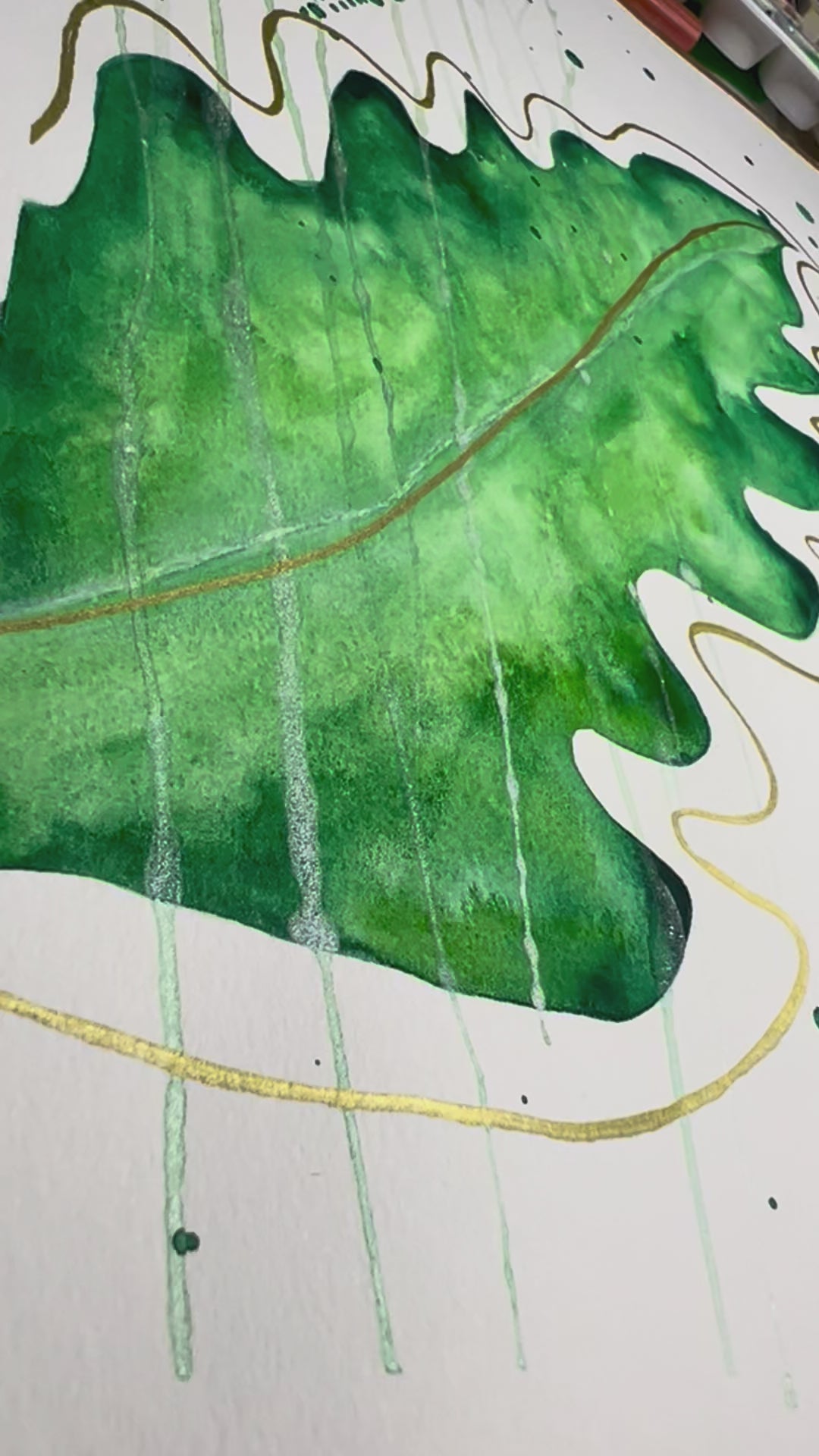 This original watercolor artwork features an organic leaf form painted in a rich palette of vibrant and deep greens. Delicate drips, spontaneous splashes, and flowing gold lines create movement and depth, symbolizing growth, transformation, and a strong connection to nature.