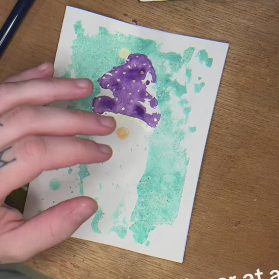 Ce gnome au bonnet violet parsemé de flocons, entouré d’éclaboussures vertes et hivernales, incarne la magie, la créativité et l’esprit chaleureux de Noël.