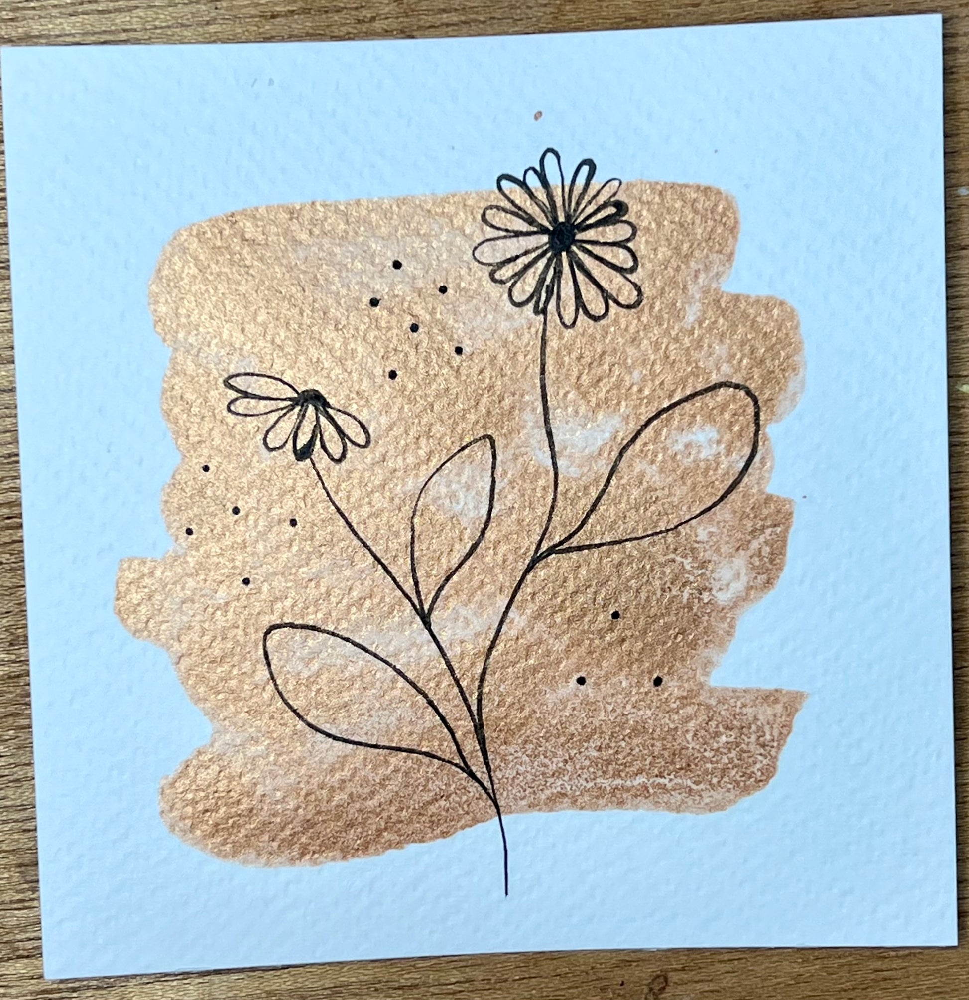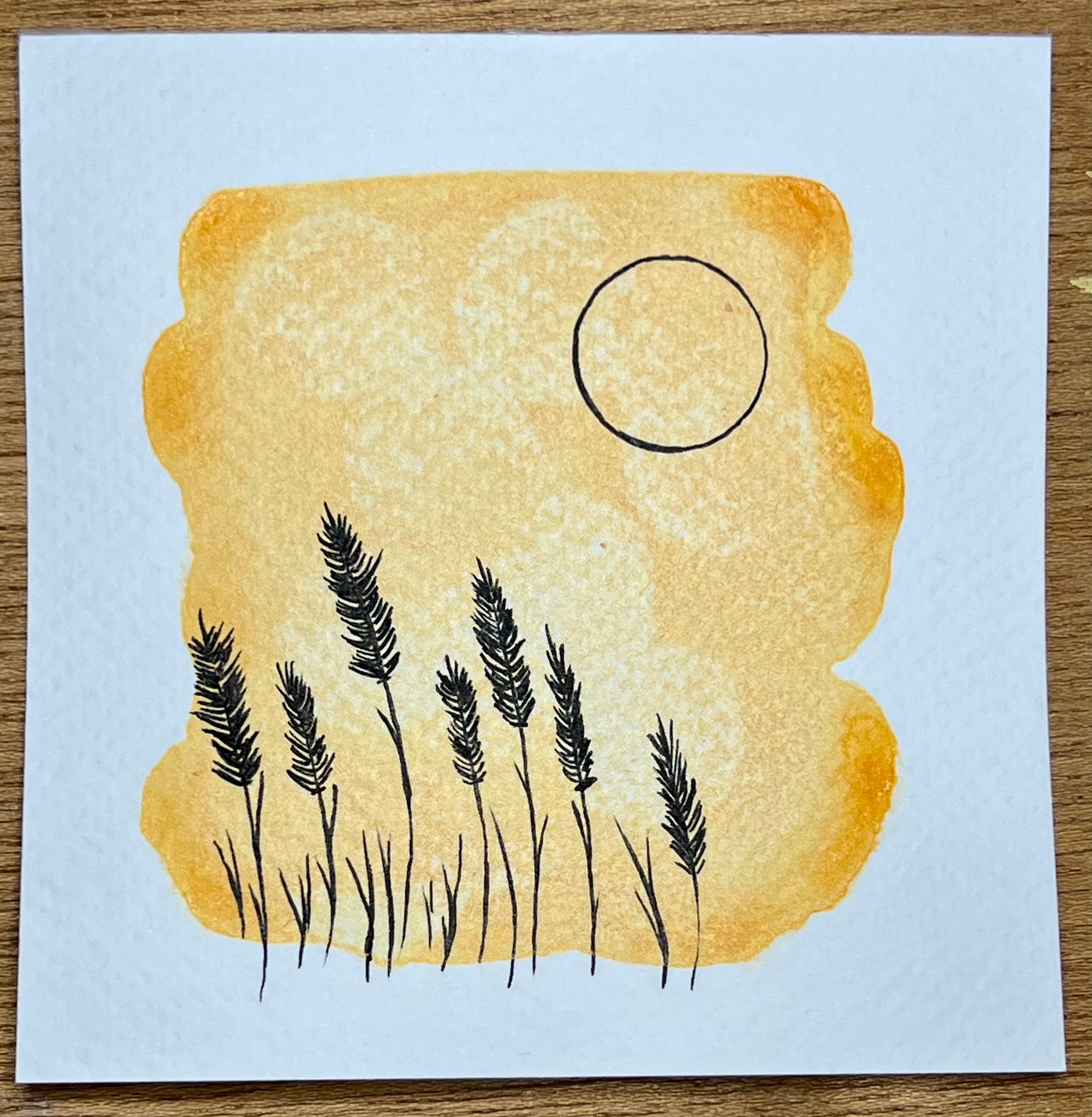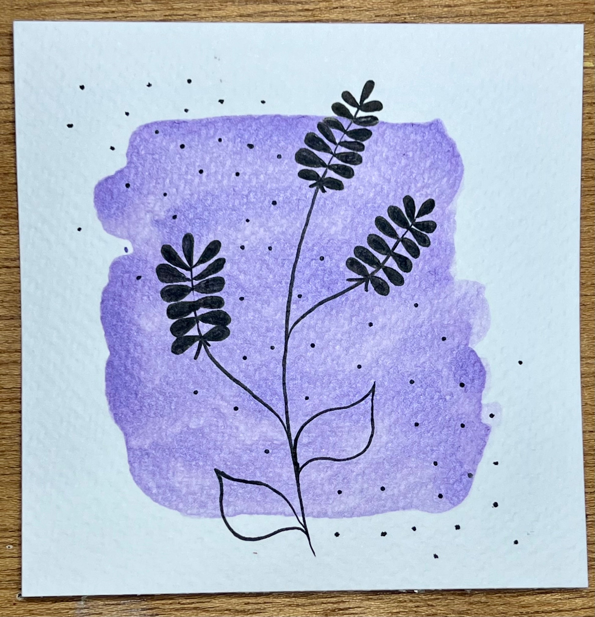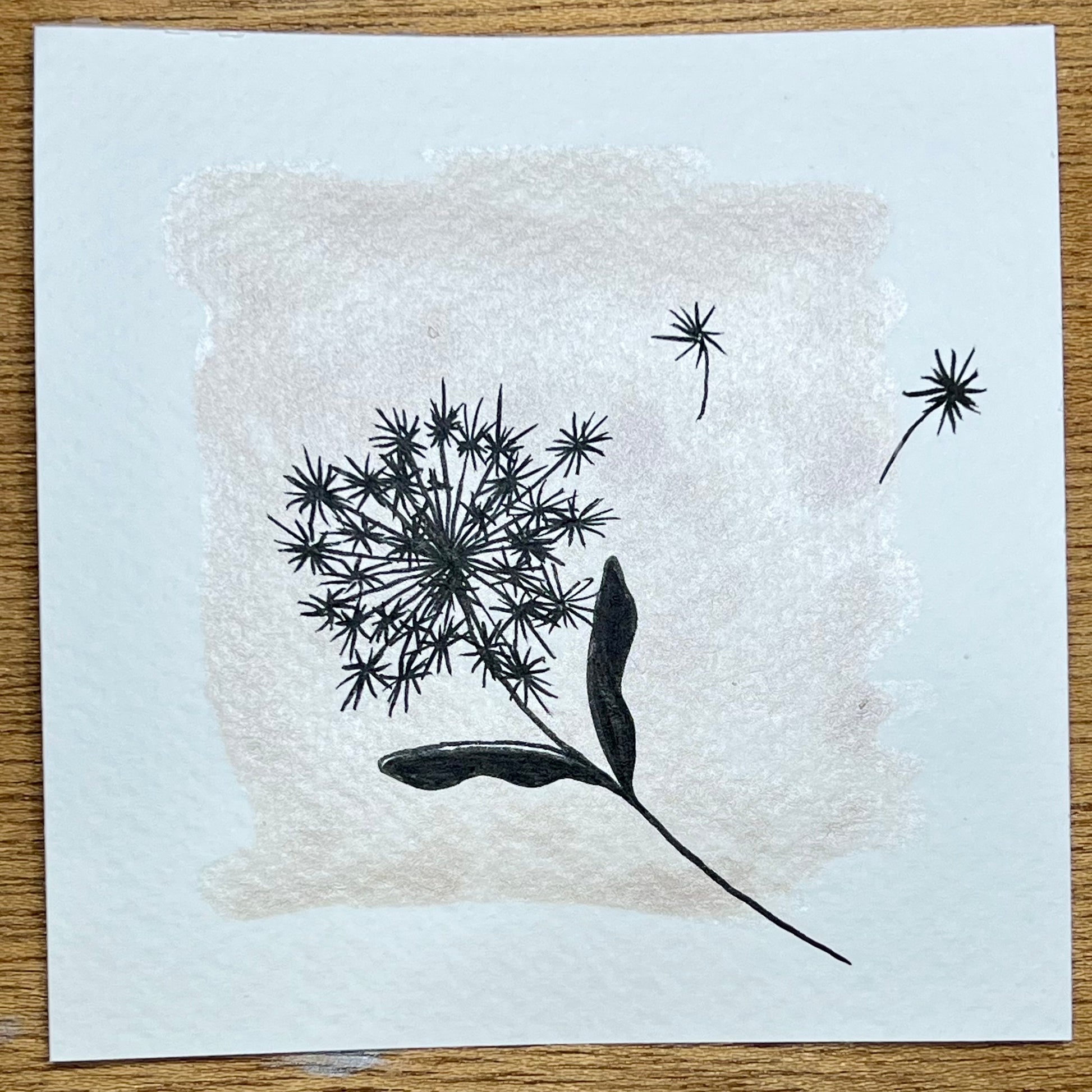 This collection features four original 4x4 mini artworks, hand-painted using watercolor and black ink.